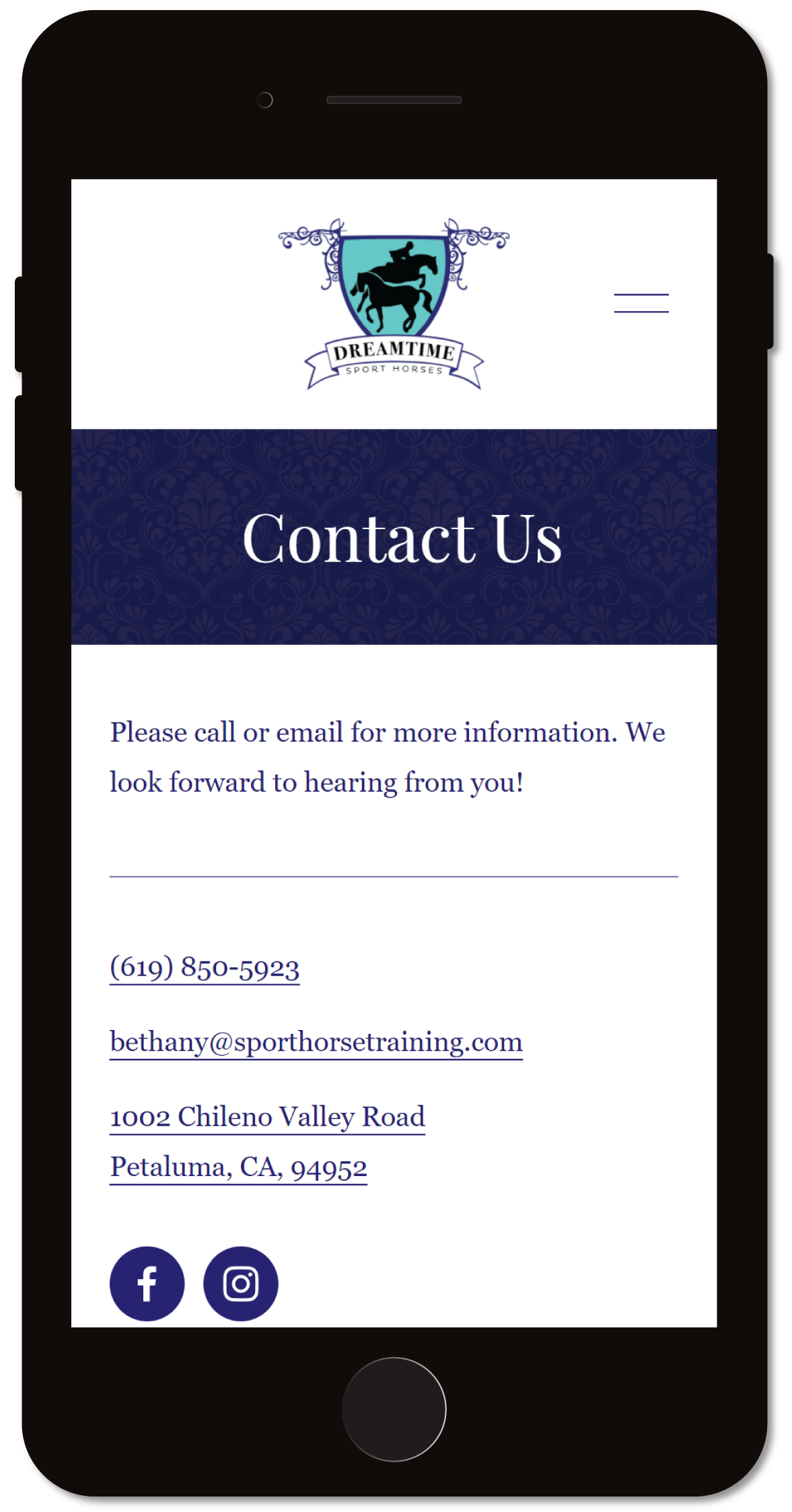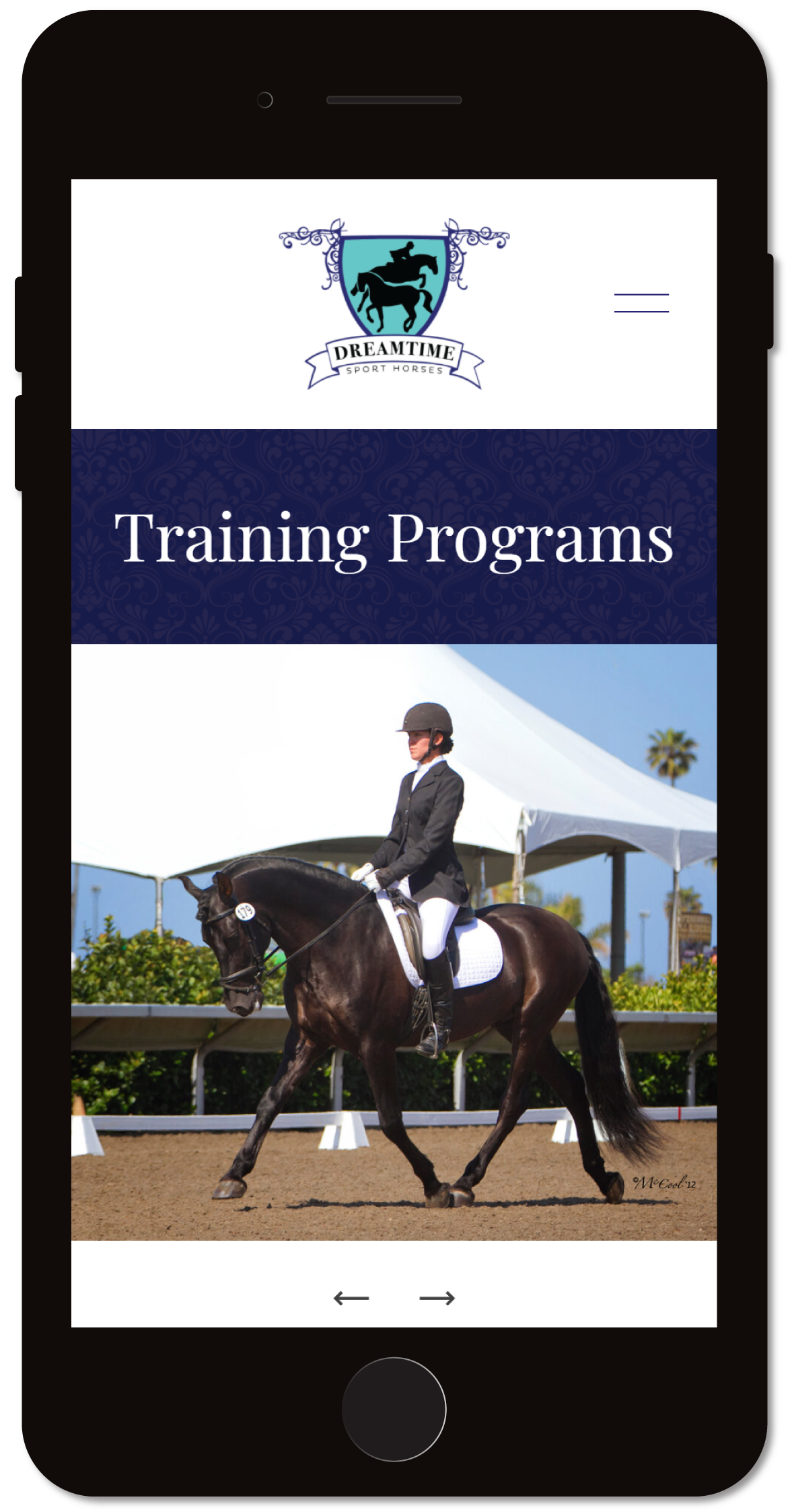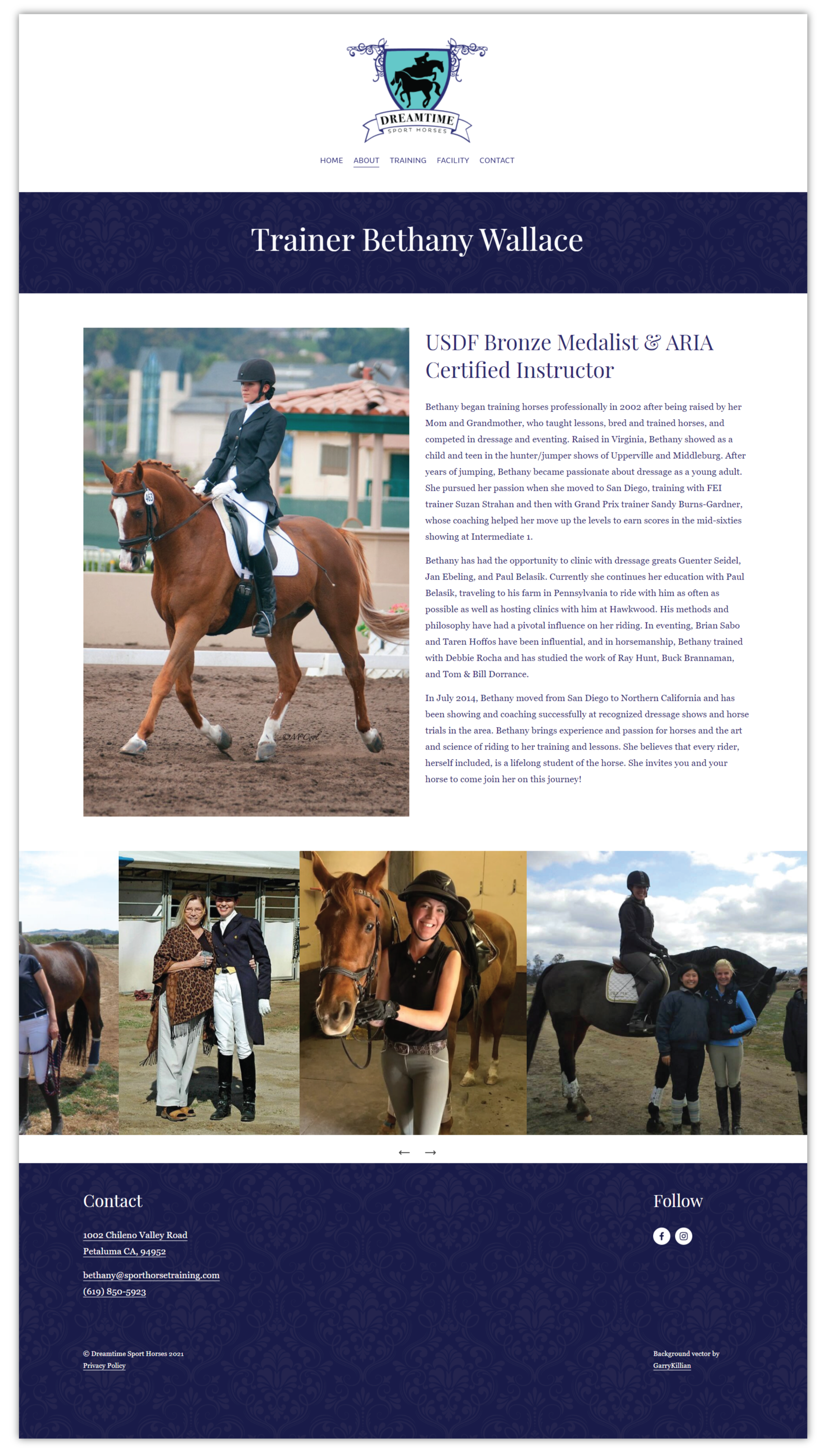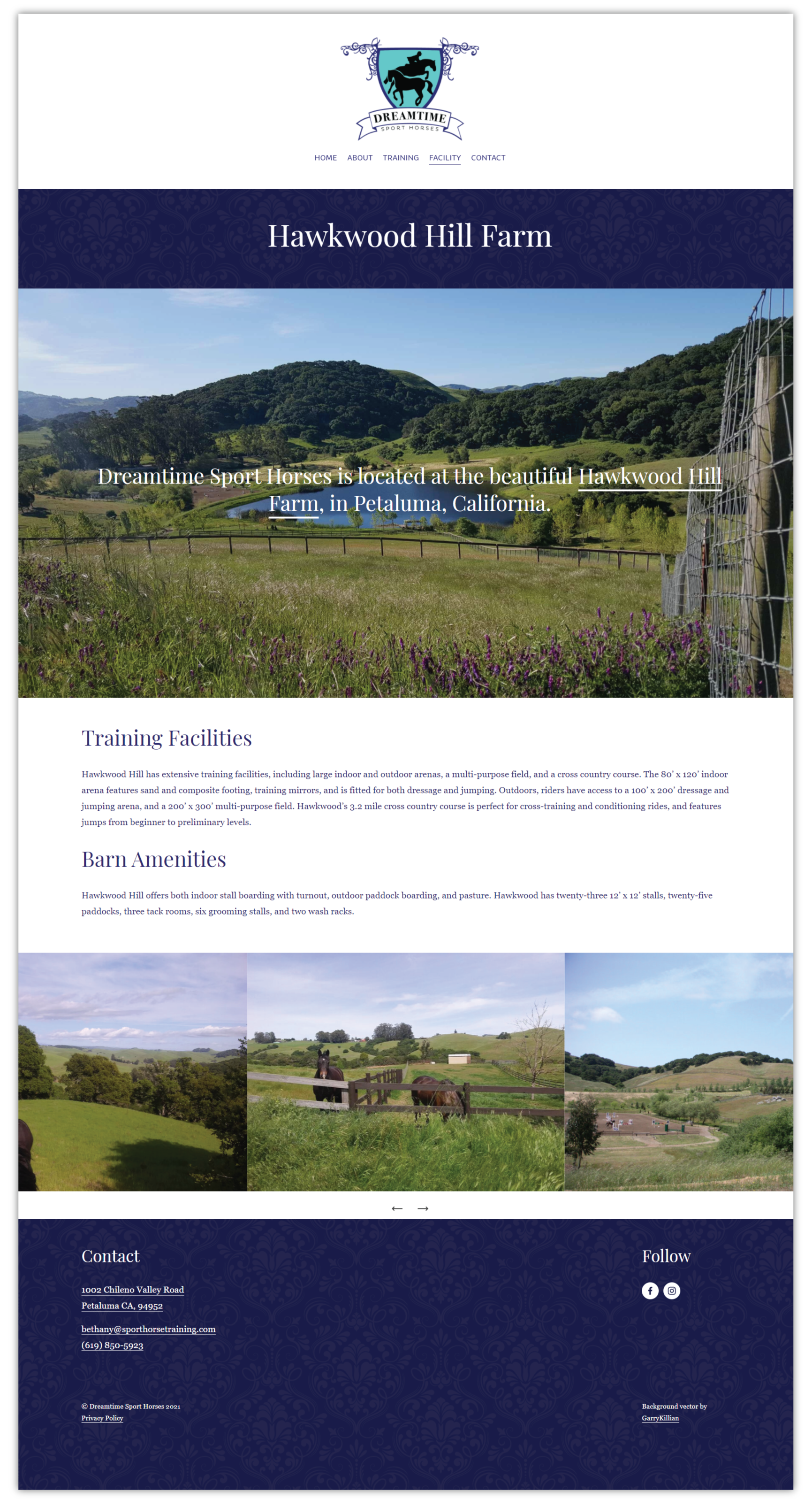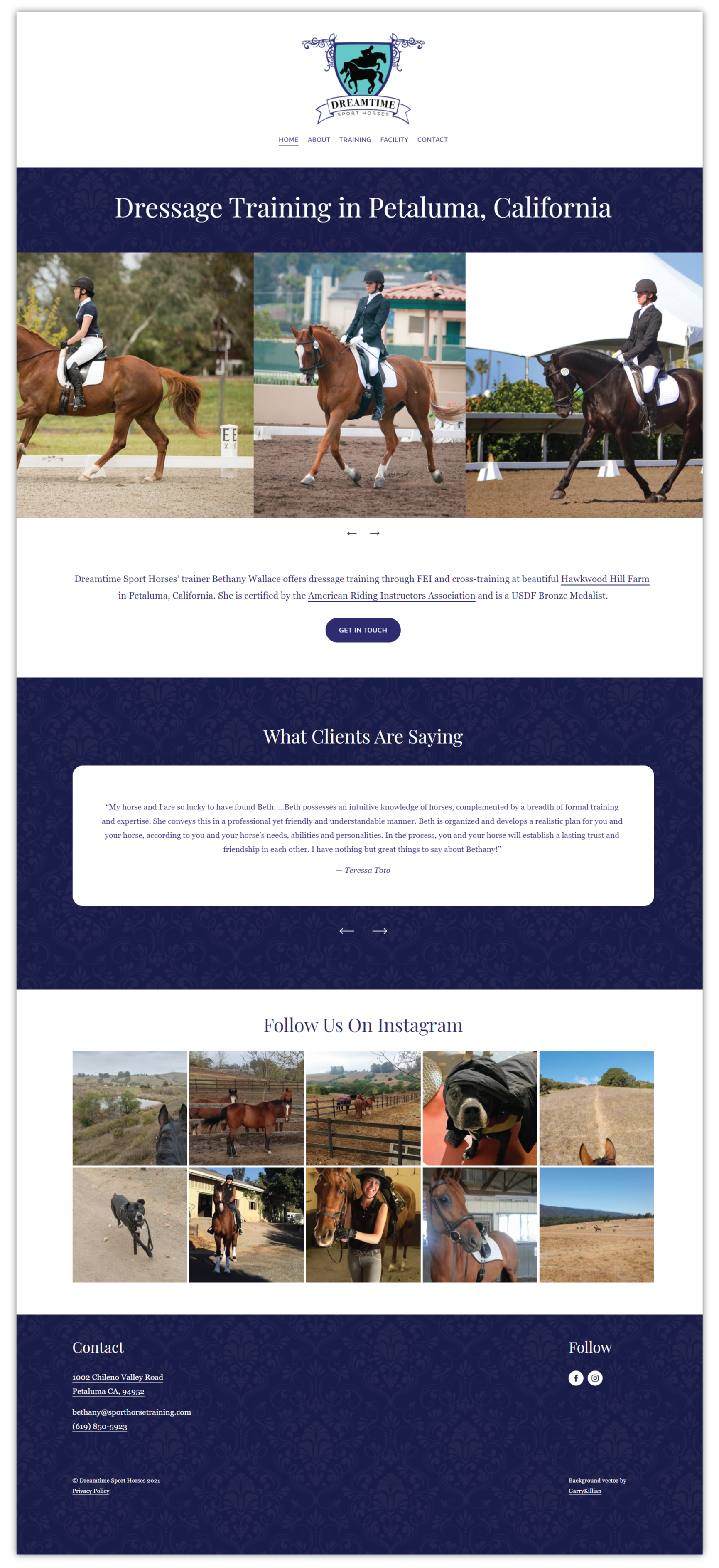 Dreamtime Sport Horses offers dressage training and cross-training at Hawkwood Hill Farm in Petaluma, California. Their website was older and not mobile-friendly, and they requested a modern website that would display beautifully on both desktop and mobile devices. Using Dreamtime Sport Horse’s logo for inspiration, I created a color palette and design mockups. After discussing different design options, I created Dreamtime Sport Horses’ new website on the Squarespace platform with Squarespace 7.1.